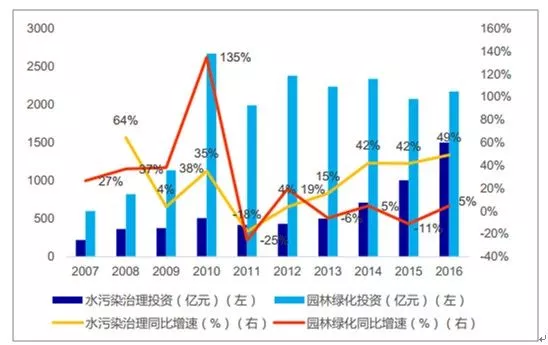 园林绿化及水污染治理 2016 年合计投资额增速约为 19%,较 15 年提升 18 个百分点